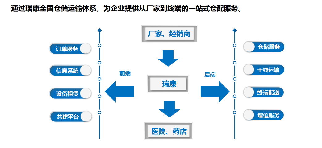 公司依托全国仓干配一体化的物流网络布局,为医药生产批发零售企业客户提供专业、定制化、标准化的仓储配送综合解决方案。